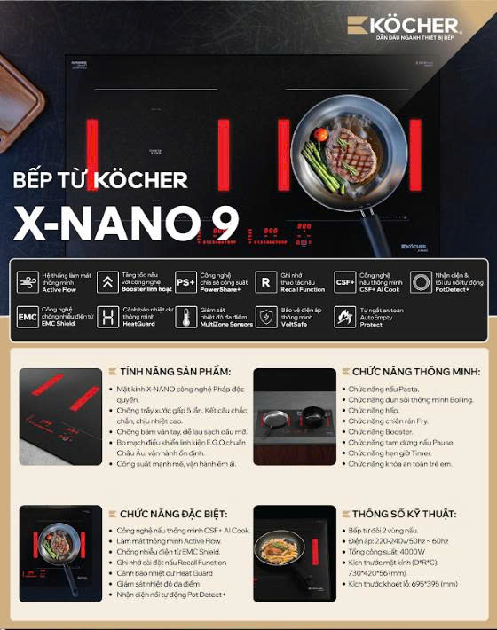 Bếp Từ Kocher X-Nano 9 là dòng sản phẩm cao cấp mới nhất trong series X-NANO, kết hợp mặt kính X-NANO độc quyền từ Pháp và công nghệ GX từ E.G.O – Made in Germany. Với thiết kế sang trọng, công suất mạnh mẽ và hàng loạt tính năng thông minh – an toàn, sản phẩm mang đến trải nghiệm nấu ăn hiện đại, tiện nghi và đẳng cấp cho mọi gia đình.