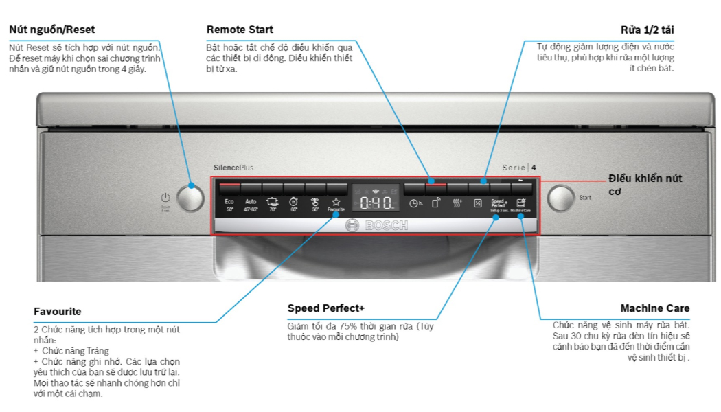 4 tính năng rửa thêm: Home Connect, tăng tốc, một nửa, sấy thêm