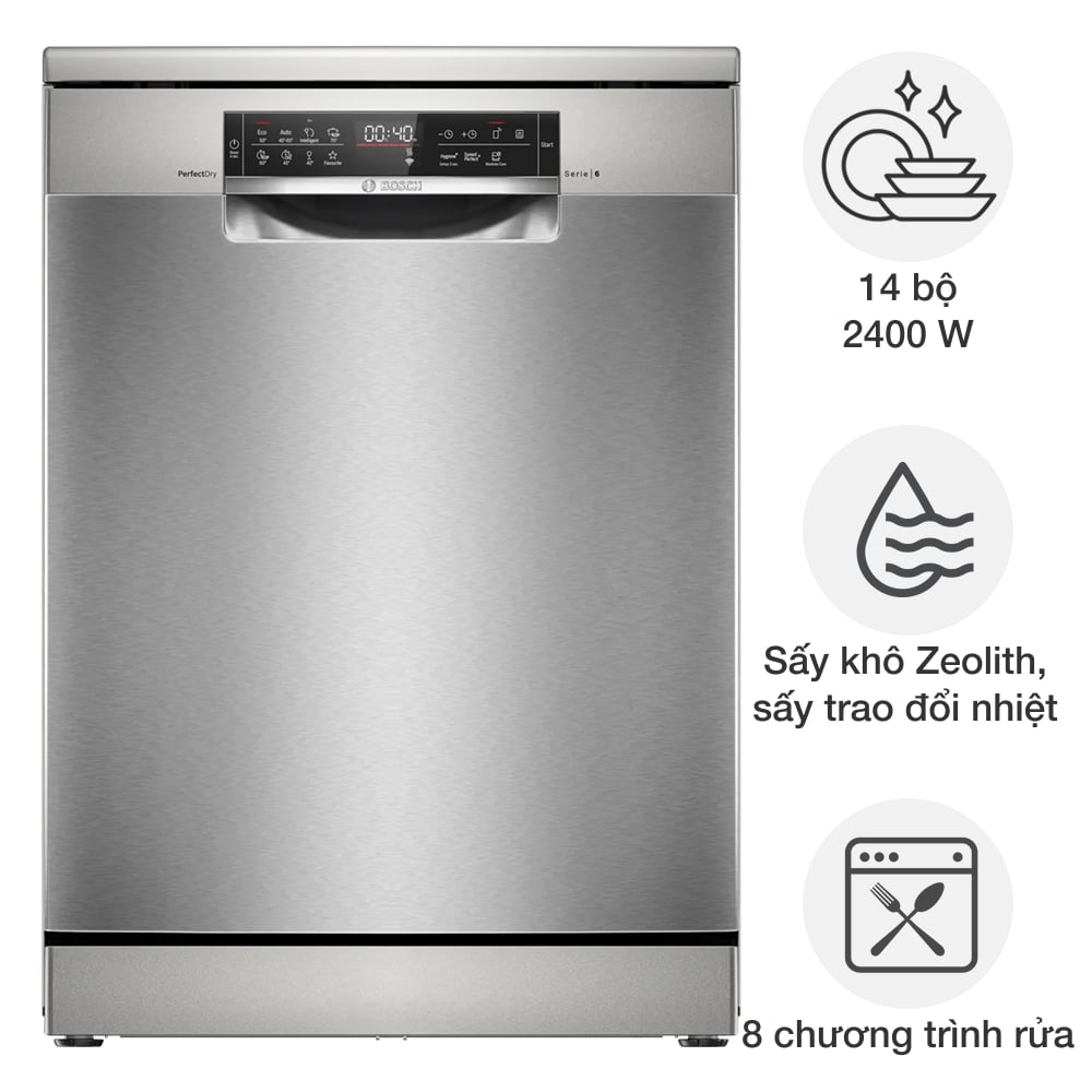 Bosch SMS6ZCI01P là model máy rửa bát độc lập cao cấp với sức chứa lên đến 14 bộ đồ ăn Châu Âu, phù hợp với gia đình đông người. Máy tích hợp các công nghệ mới nhất của Bosch như sấy khô Zeolith®, Home Connect điều khiển từ xa, cảm biến thông minh và hệ thống giỏ linh hoạt Rackmatic 3 mức. Tất cả được gói gọn trong thiết kế inox chống bám vân tay, bền đẹp và sang trọng.