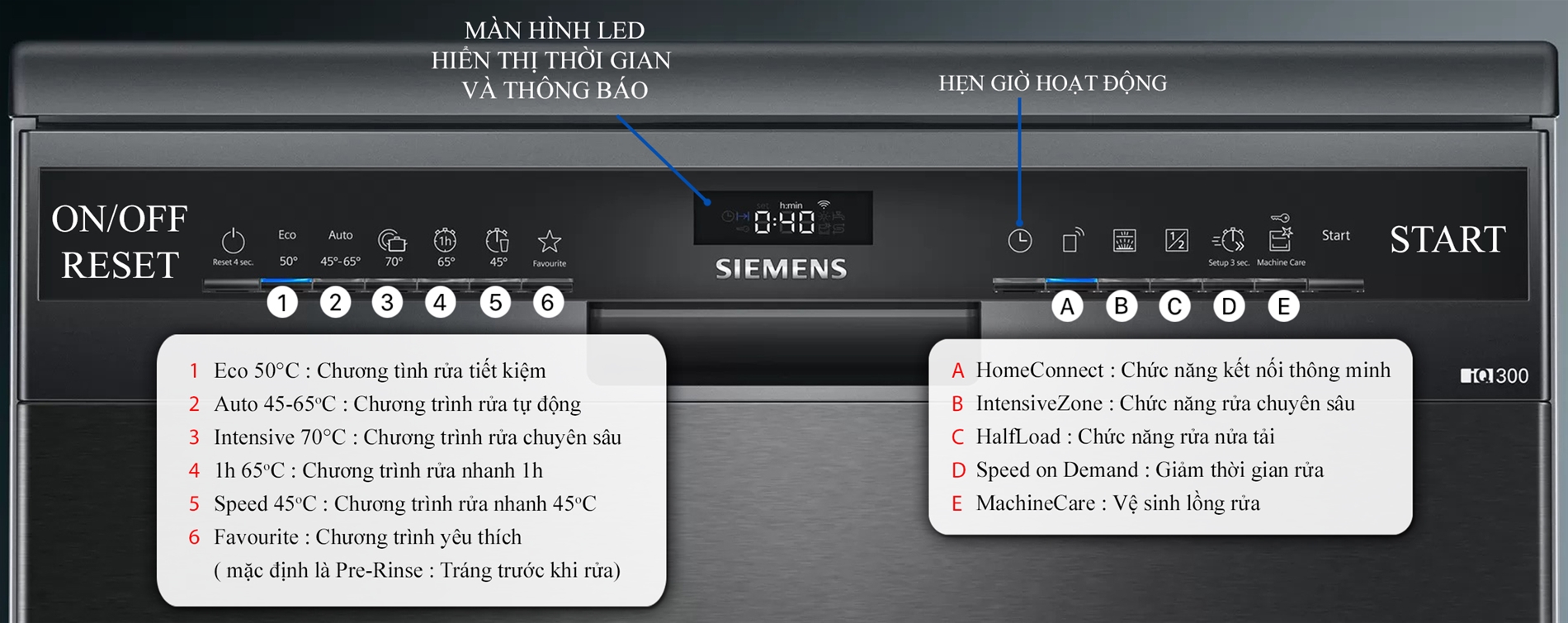 | Tự động 45-65ºC, Tiết kiệm 50ºC, Yêu thích, Rửa mạnh 70ºC, Nhanh 60′, Yên lặng | Nửa tải, Vệ sinh máy, vùng rửa mạnh Tăng tốc rửa, Kết nối điện thoại | |||