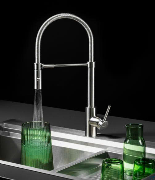 Với những đường cong tinh tế, bề mặt inox mờ chống bám vân tay, mẫu vòi này tạo điểm nhấn hiện đại cho gian bếp mà không cần thêm phụ kiện trang trí.